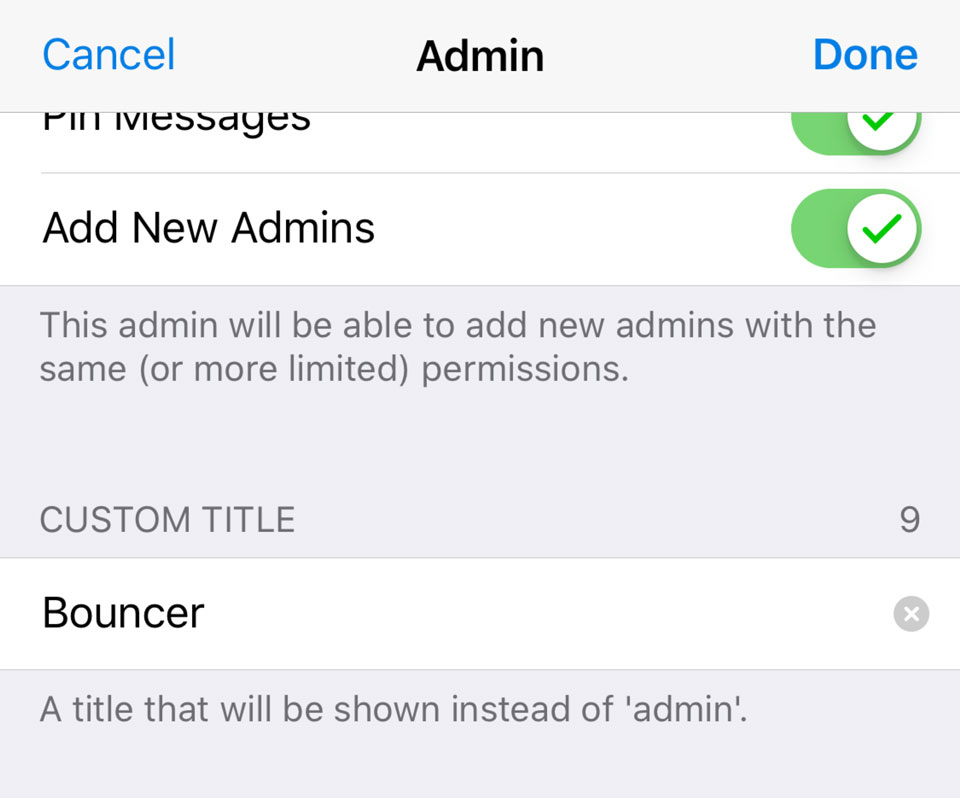 If new time-lord powers aren't enough, group owners can now set custom titles for admins like ‘Meme Queen’, ‘Spam Hammer’ or ‘El Duderino’.